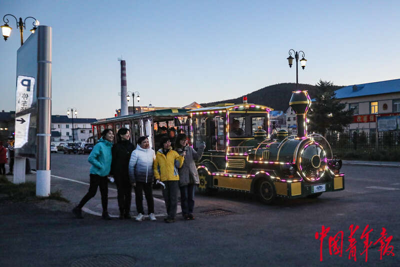 9月22日傍晚,内蒙古兴安盟阿尔山市阿尔山火车站旁,几名游客在火车造型的游览车旁合影留念。孔斯琪/摄