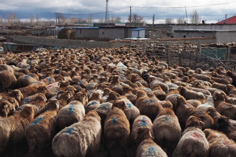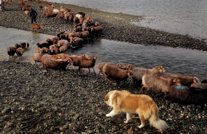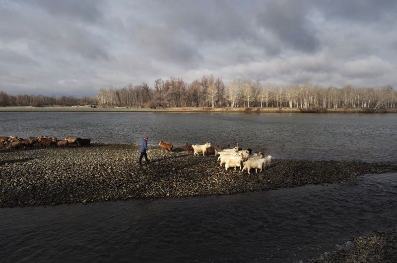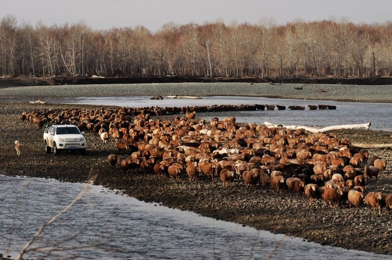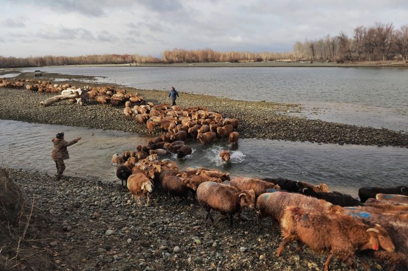 2023年11月20日,新疆阿勒泰,布尔津县窝依莫克镇喀拉库勒村职业代牧人赶着12户的1200只羊,跨过布尔津河,从秋牧场向冬牧场(冬窝子)迁徙。(钱捍/视觉中国)