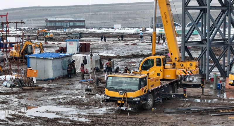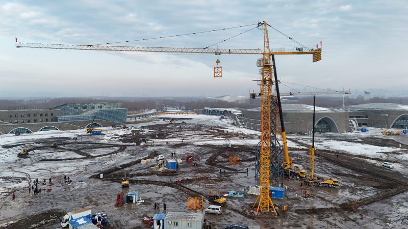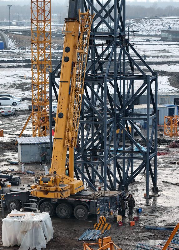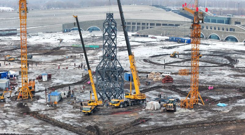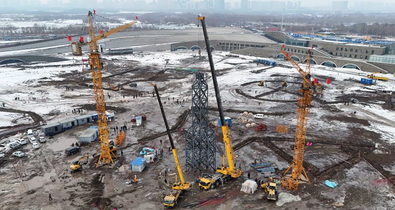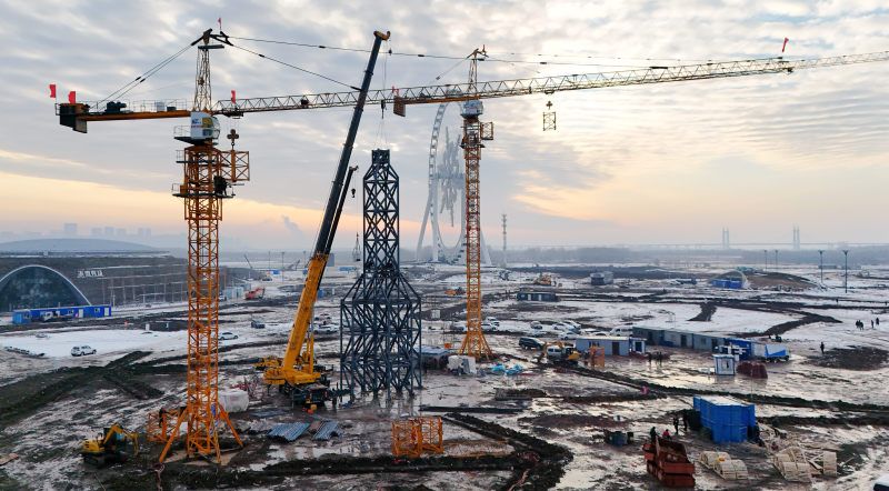 2023年11月21日,哈尔滨,第25届哈尔滨冰雪大世界的建设已拉开帷幕,43米高的主塔钢结构动工搭建,哈尔滨冰雪大世界园区建设进入了新的阶段。