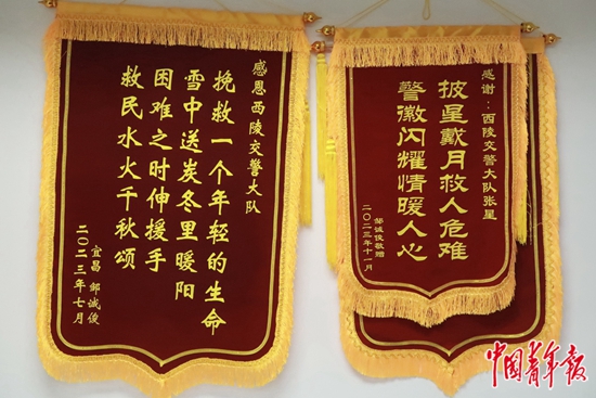 他给3位交警和出租车司机冉明都定了锦旗。但冉明没收,只是告诉他:“要阳光一点哦!还年轻!”