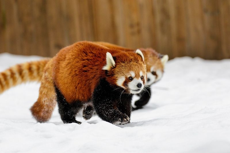 2016年2月23日消息(具体拍摄时间不详),加拿大魁北克,两只小红熊猫在雪地里玩耍,玩起了“警察与罪犯”的游戏,一只小红熊猫双手抬起,另一只则做出了“举枪”的动作。摄影师Dominic Marcoux在魁北克的Granby动物园捕捉下了这一有趣画面。