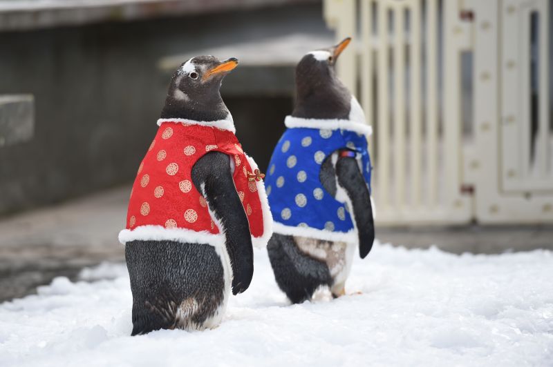 2023年1月15日下午,南京海底世界,两只3岁大的小企鹅走出场馆赏雪。