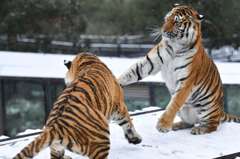 2022年2月22日,昆明市迎来降雪,云南野生动物园的东北虎在雪地中玩耍。 中新社记者 刘冉阳 摄
