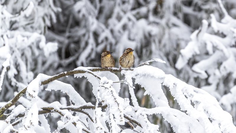 2023年1月3日,重庆市,南川区金佛山景区矛纹噪鹛停留在雪中枝头上。