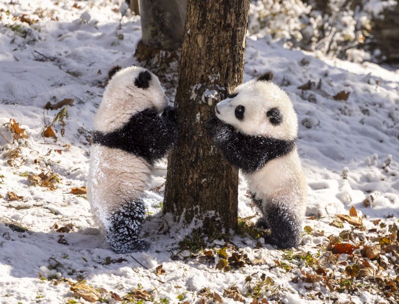 2022年1月13日,中国大熊猫保护研究中心四川汶川县耿达镇神树坪研究基地,大熊猫在雪地里嬉戏玩耍,奶糯可爱。