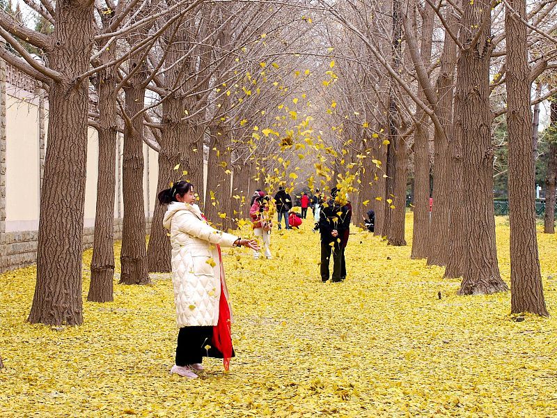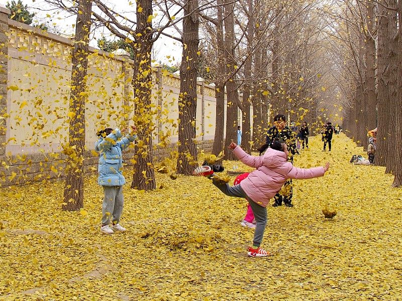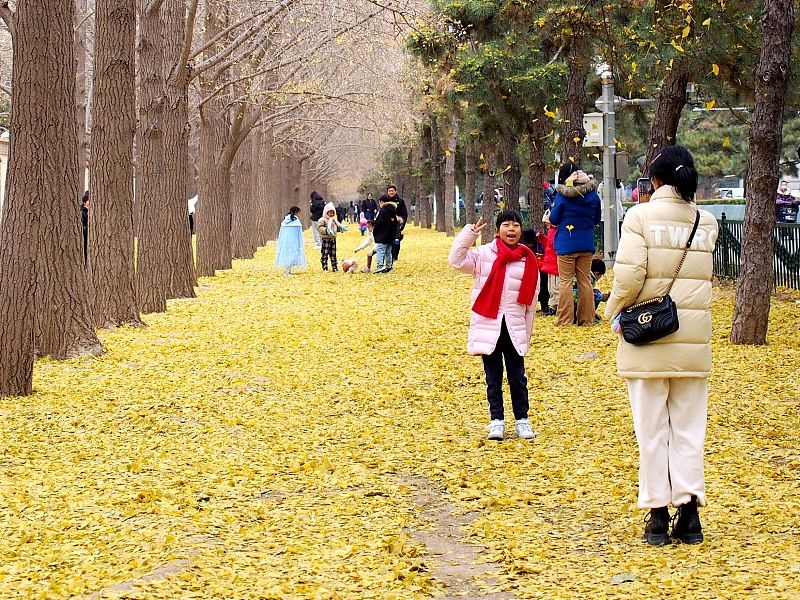 11月26日,北京钓鱼台银杏大道,金黄的落叶铺满地面,吸引市民赏景拍照。