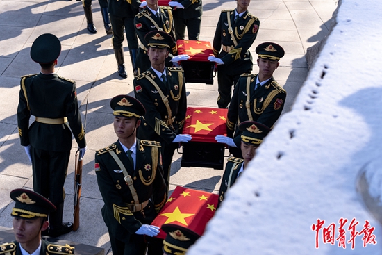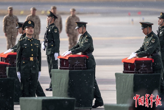 11月23日上午,25位在韩中国人民志愿军烈士遗骸及遗物由中国空军运-20运输机接运,在歼-20战斗机护航下,从韩国仁川国际机场抵达沈阳桃仙国际机场。现场白雪飘飘,恰如烈士们70余年前出征时的场景。