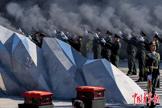 11月24日上午,在沈阳抗美援朝烈士陵园的下沉式纪念广场,军乐队奏响《思念曲》,礼兵护送志愿军烈士棺椁缓缓步入现场。礼兵鸣枪,众人鞠躬致敬。随着《思念曲》再次低回奏响,礼兵们抬起志愿军烈士棺椁缓缓走向安葬地宫。抗美援朝战争中,19.7万多名官兵献出了年轻的生命。2014年至今,共有938位在韩志愿军烈士遗骸归国安葬。