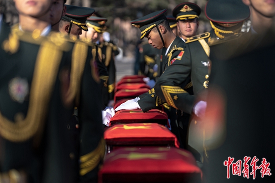 礼兵按序依次护送烈士棺椁至整理区后,认真地擦拭着每一位志愿军烈士的棺椁,细心整理好覆盖在棺椁上的五星红旗。