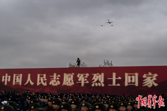 北京时间9时,中韩双方在韩国仁川国际机场举行志愿军烈士遗骸交接仪式。经过一个多小时的飞行后,空军专机运-20缓缓降落在辽宁沈阳桃仙国际机场。专机进入中国领空后,空军两架歼-20战斗机护航,并在沈阳机场上空通场。随后,志愿军烈士遗骸迎回仪式举行。