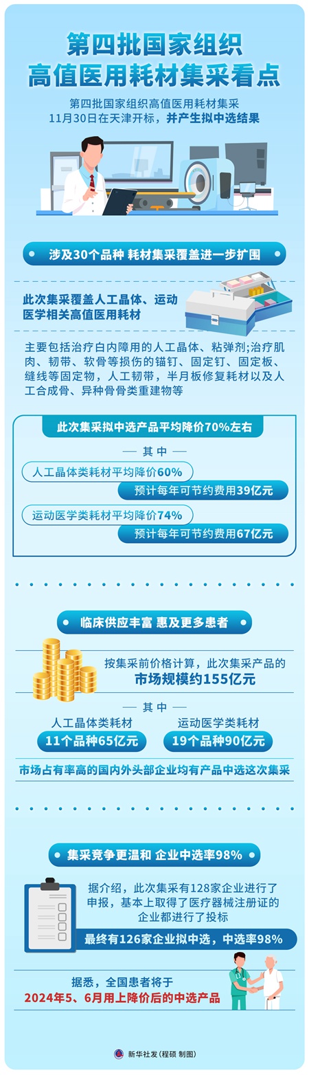 据了解,此次集采覆盖了人工晶体所有类别的全系列产品,人工晶体类耗材平均降价60%。而运动医学类耗材此次集采平均降价74%。此前,人工关节、骨科脊柱等产品已经进行了国家集采,创伤类耗材是由跨省联盟开展集采。这次运动医学类耗材产品的加入,意味着骨科四大类高值医用耗材基本实现集采全覆盖。