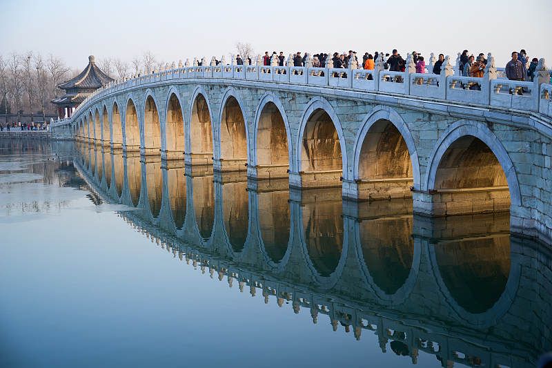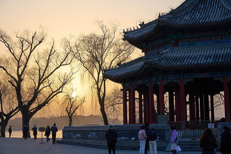 2023年12月7日,北京,颐和园十七孔桥“金光穿洞”美景。