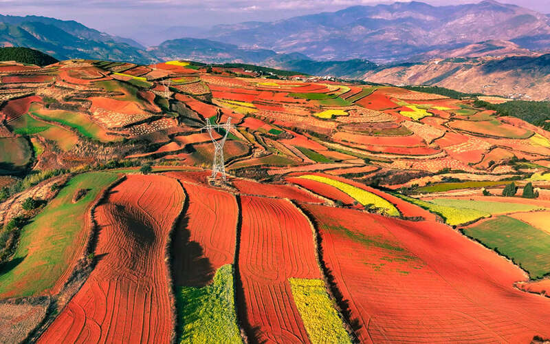 在这片土地上,经过千百年雨水的洗礼,土地里的钙、钠等元素慢慢溶解流失,剩下难以溶解的铁、铝等氧化物逐渐沉积,氧化铁和氧化铝把土壤染成了鲜艳的红色和温暖的褐色,再加上地壳运动和人类农耕活动将土地渐渐打磨成块状梯田,最终形成了具有“七彩云南经典缩影”之称的红土地。