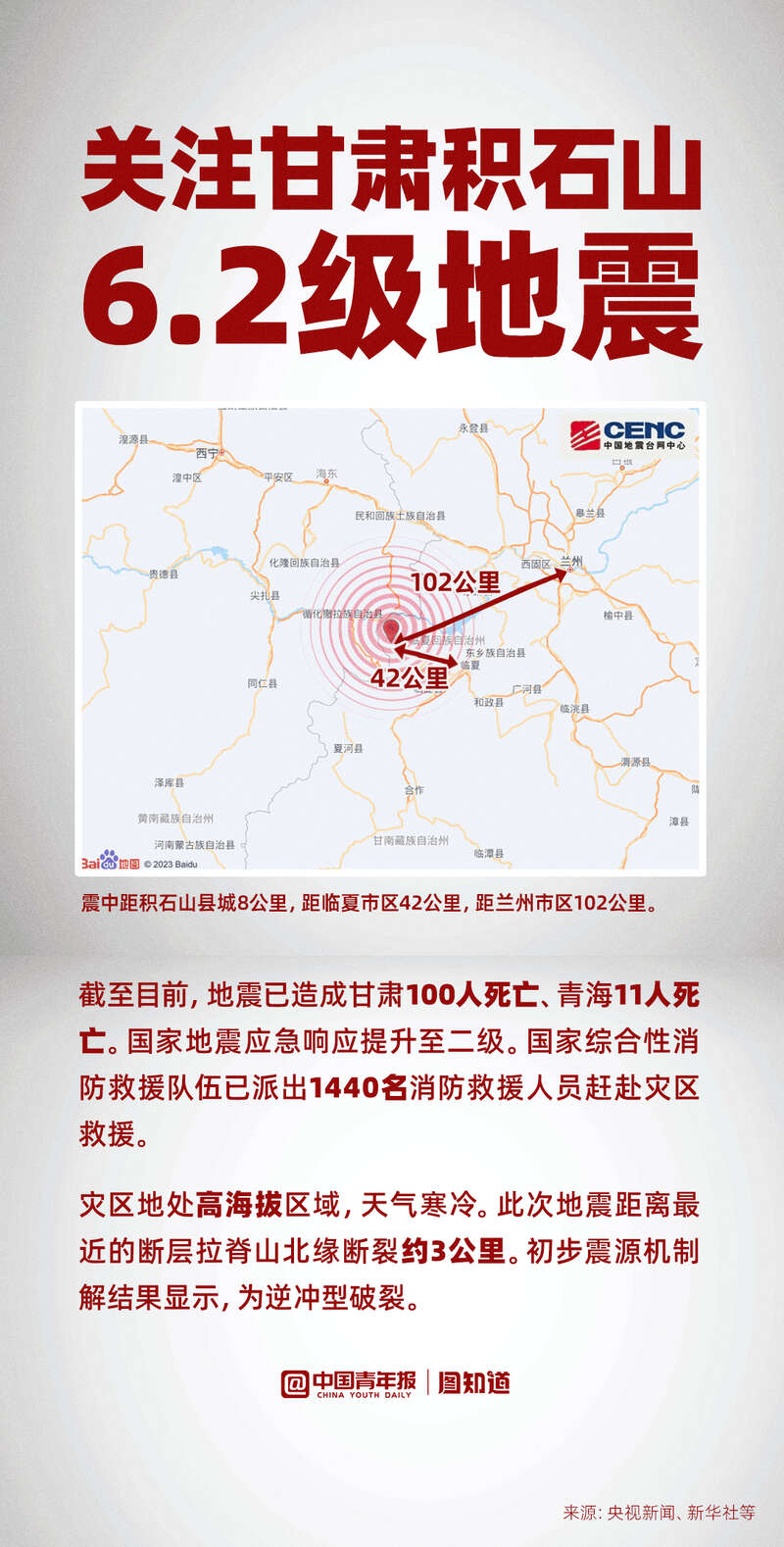 12月18日23时59分,甘肃临夏州积石山县发生6.2级地震,震源深度10公里。此次地震位于甘东南地区,海拔较高。国家地震应急响应提升至二级。救援正在争分夺秒进行中⬇️