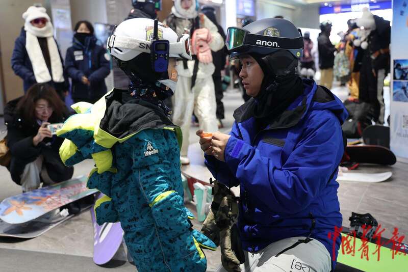 12月19日,在位于新疆阿勒泰市的将军山国际滑雪度假区,一位父亲在运动前给孩子脸上贴防冻脸贴。中青报·中青网记者 谢洋/摄