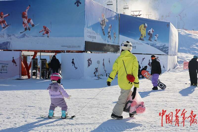 12月19日,在位于新疆阿勒泰市的将军山国际滑雪度假区,一位母亲拉着孩子在雪地上滑行。中青报·中青网记者 谢洋/摄
