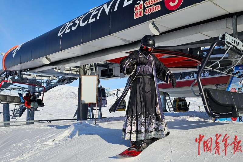 12月19日,在位于新疆阿勒泰市的将军山国际滑雪度假区,一位身穿汉服的游客准备开始滑行。中青报·中青网见习记者 刘释诚/摄