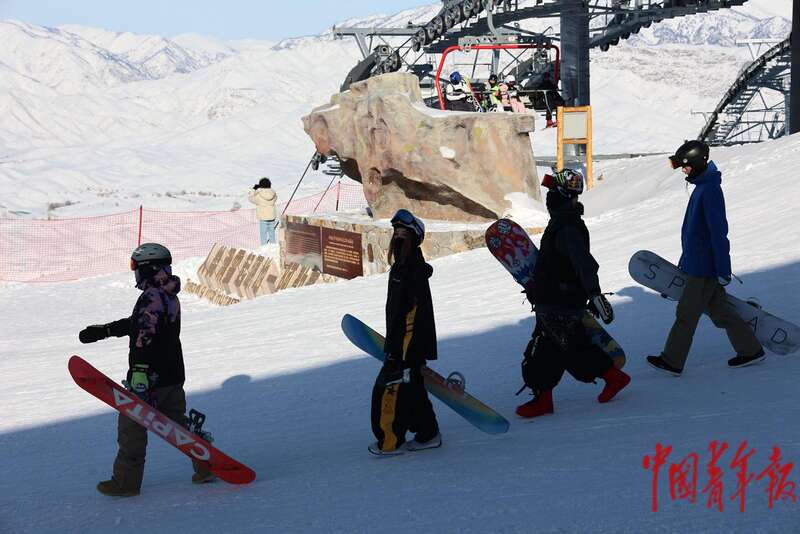 12月19日,在位于新疆阿勒泰市的将军山国际滑雪度假区,几名游客提着滑板准备体验滑雪。中青报·中青网记者 谢洋/摄