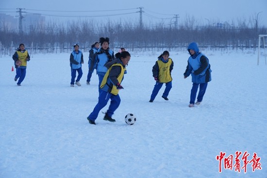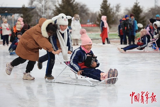 一人用力踩动自行车,带动几十米长滑轨上的木质小车转动,这个游戏吸引了五一农场学校六年级学生陈瑞琪和同学来打卡。陈瑞琪有点害怕,他坐在小车里被卡在半空中,不断地呼喊同学“快点骑”,终于让小车如同过山车一般俯冲下来。“好玩,太好玩了!”男孩们心满意足地奔向下一个雪地游戏。