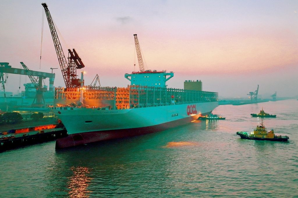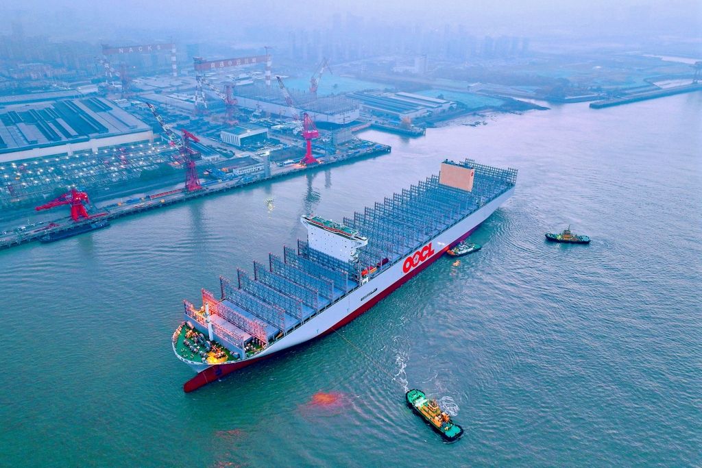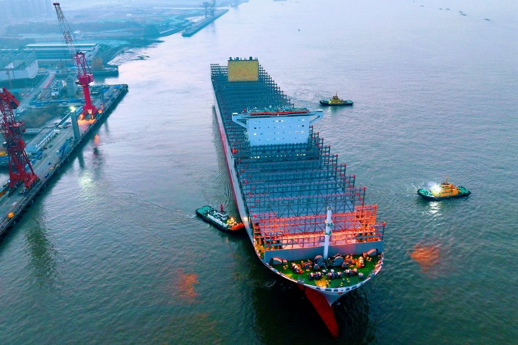 2024年1月9日,江苏南通,“中运川崎396”轮在江苏省南通中远海运川崎船舶工程有限公司离泊,准备出江入海试航。
