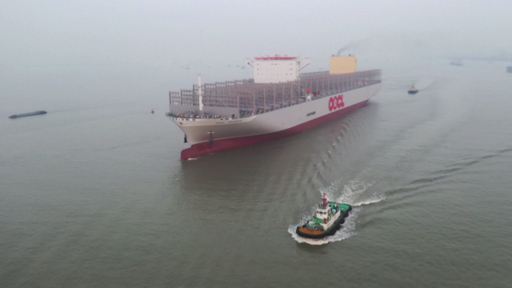 2024年1月9日,江苏南通,“中运川崎396”轮离开江苏省南通中远海运川崎船舶工程有限公司泊位后,经过长江南通段驶向大海试航。(视频截图)