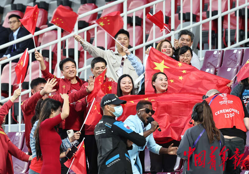 1月13日,卡塔尔多哈阿卜杜拉·本·哈里发体育场,2023年卡塔尔亚洲杯足球赛小组赛A组第一轮,中国男足迎战塔吉克斯坦队的比赛现场,看台上的中国球迷。刘占崑/摄