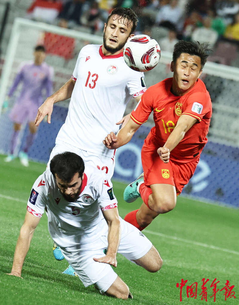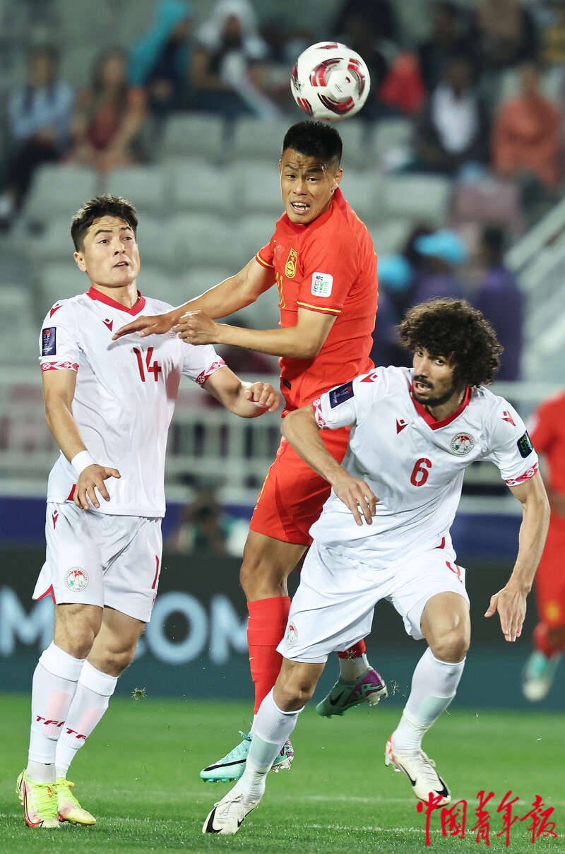 1月13日,卡塔尔多哈阿卜杜拉·本·哈里发体育场,2023年卡塔尔亚洲杯足球赛小组赛A组第一轮,中国男足迎战塔吉克斯坦队的比赛,中国队11号谭龙(中)与对方争头球。刘占崑/摄