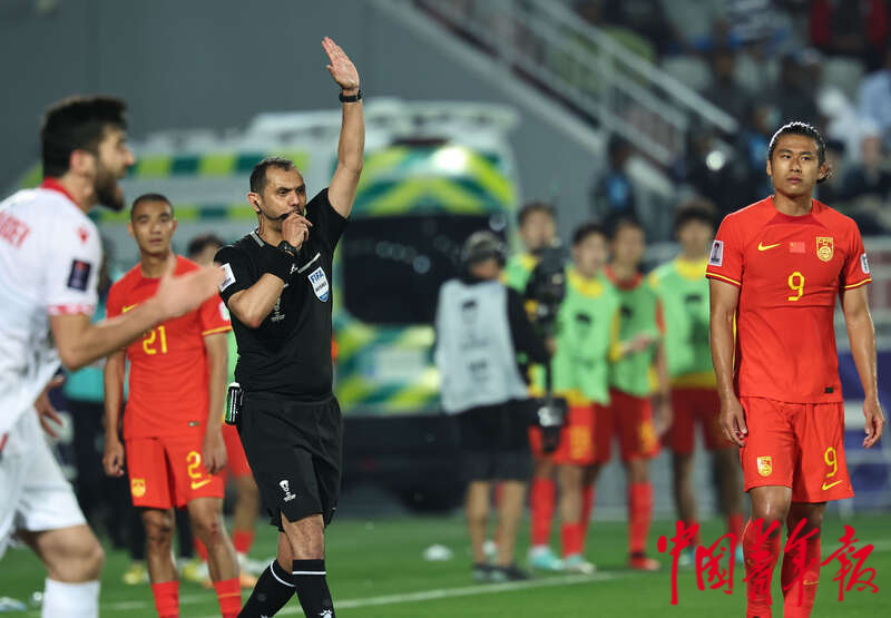 1月13日,卡塔尔多哈阿卜杜拉·本·哈里发体育场,2023年卡塔尔亚洲杯足球赛小组赛A组第一轮,中国男足迎战塔吉克斯坦队的比赛,主裁判吹罚中国队进球无效,中国队9号张玉宁(右一)一脸无奈。刘占崑/摄