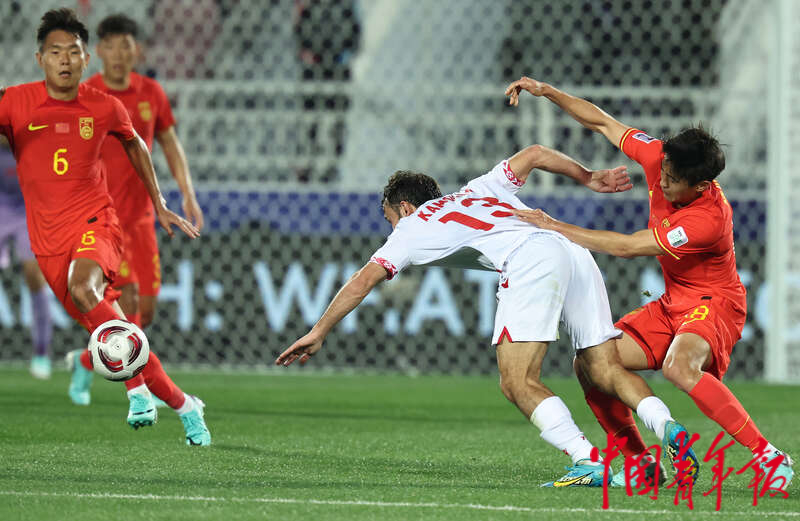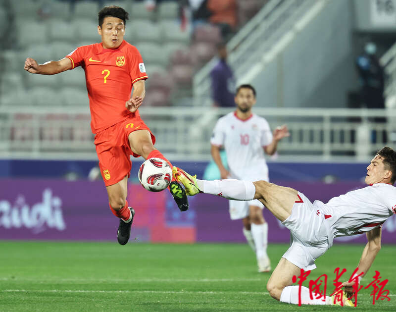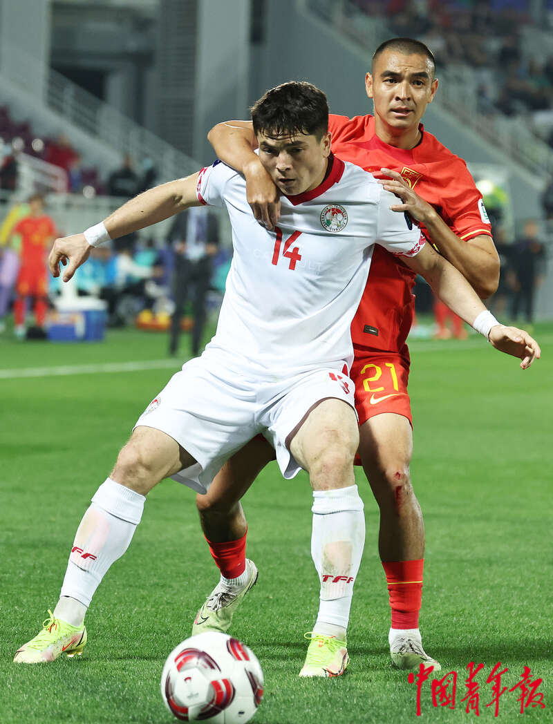 1月13日,卡塔尔多哈阿卜杜拉·本·哈里发体育场,2023年卡塔尔亚洲杯足球赛小组赛A组第一轮,中国男足迎战塔吉克斯坦队的比赛,中国队21号刘彬彬(后)与对方14号舒库罗夫争抢。刘占崑/摄