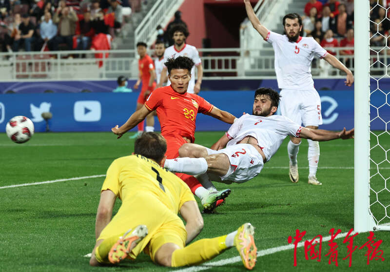 1月13日,卡塔尔多哈阿卜杜拉·本·哈里发体育场,2023年卡塔尔亚洲杯足球赛小组赛A组第一轮,中国男足迎战塔吉克斯坦队的比赛,双方在塔吉克斯坦队禁区内展开激烈争夺。刘占崑/摄