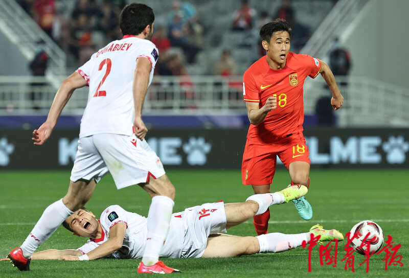 1月13日,卡塔尔多哈阿卜杜拉·本·哈里发体育场,2023年卡塔尔亚洲杯足球赛小组赛A组第一轮,中国男足迎战塔吉克斯坦队的比赛,中国队18号戴伟浚(右)带球进攻。刘占崑/摄