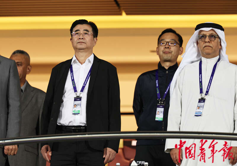 1月13日,卡塔尔多哈阿卜杜拉·本·哈里发体育场,2023年卡塔尔亚洲杯足球赛小组赛A组第一轮,中国男足迎战塔吉克斯坦队,中国足协主席宋凯到场观看比赛。刘占崑/摄