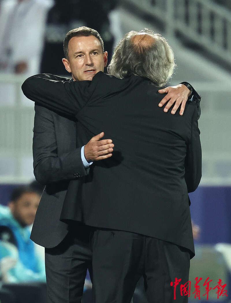 1月13日,卡塔尔多哈阿卜杜拉·本·哈里发体育场,2023年卡塔尔亚洲杯足球赛小组赛A组第一轮,中国男足迎战塔吉克斯坦队的比赛后,中国队主教练扬科维奇(左)与塔吉克斯坦主教练佩塔尔·舍格尔特拥抱。刘占崑/摄