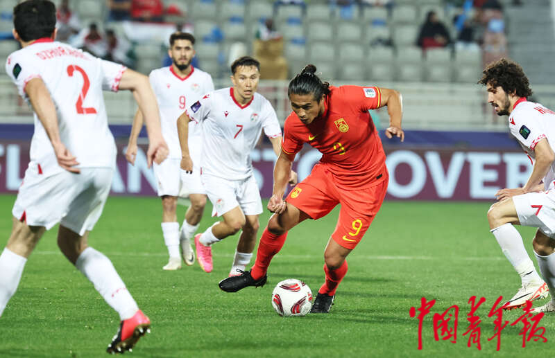 1月13日,卡塔尔多哈阿卜杜拉·本·哈里发体育场,2023年卡塔尔亚洲杯足球赛小组赛A组第一轮,中国男足迎战塔吉克斯坦队的比赛,中国队9号张玉宁(右)护球进攻。刘占崑/摄