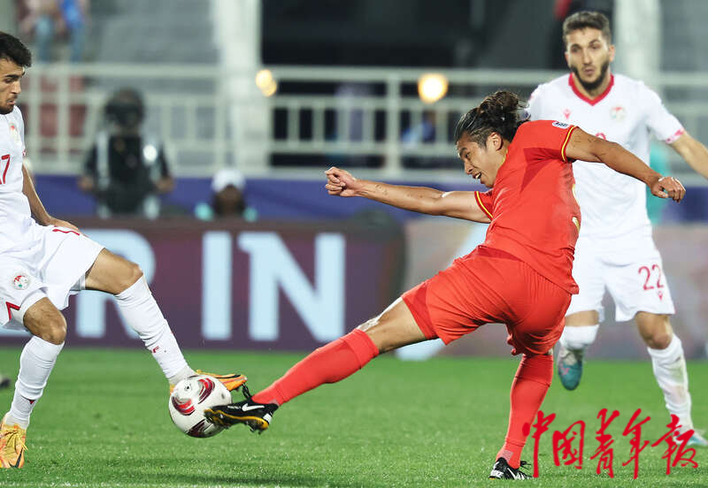 1月13日,卡塔尔多哈阿卜杜拉·本·哈里发体育场,2023年卡塔尔亚洲杯足球赛小组赛A组第一轮,中国男足迎战塔吉克斯坦队的比赛,中国队3号朱辰杰跃起头球攻门入网。因队友蒋光太被判越位,进球无效。刘占崑/摄