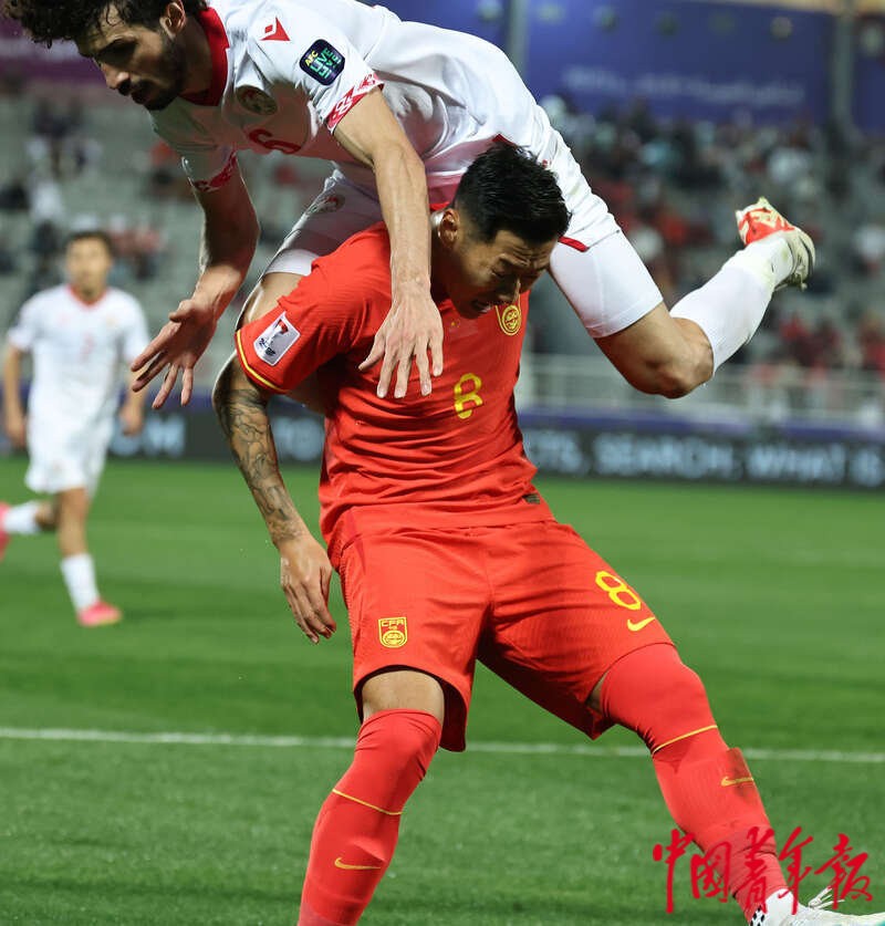 1月13日,卡塔尔多哈阿卜杜拉·本·哈里发体育场,2023年卡塔尔亚洲杯足球赛小组赛A组第一轮,中国男足迎战塔吉克斯坦队的比赛,中国队8号徐新被对方防守队员压顶。刘占崑/摄