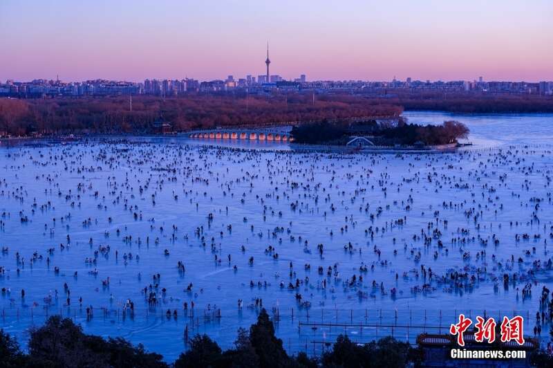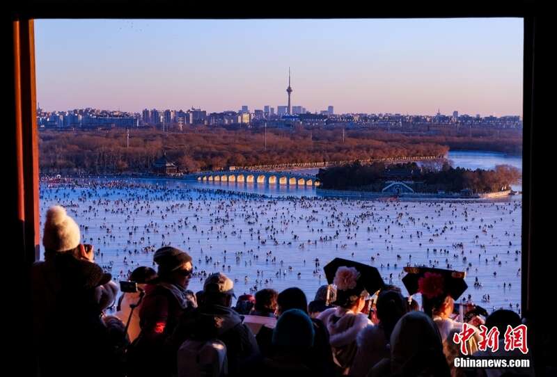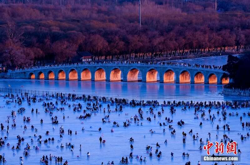 1月14日下午,北京颐和园游人如织,昆明湖变成大冰场,十七孔桥正在上演“金光穿洞”景观。虽然北京已经进入“三九”天,但颐和园等景区淡季不淡,吸引八方来客。