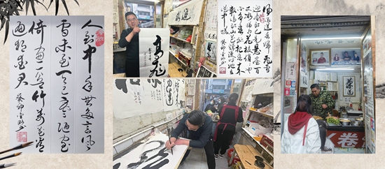 如今,有网友知道他的事情后,从外地慕名来到卷饼店打卡,也会有收藏家、书法爱好者前来订购书法作品。亢金明说,最欣慰、最幸福的是有人认可、尊重他的作品。他还抽时间去街道和社区为小学生上书法公益课,和众人分享练习书法的乐趣。“熟能生巧,巧能补拙”是他常说的话。