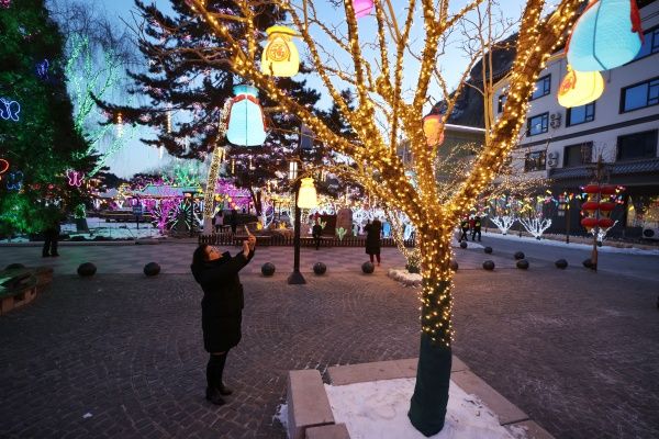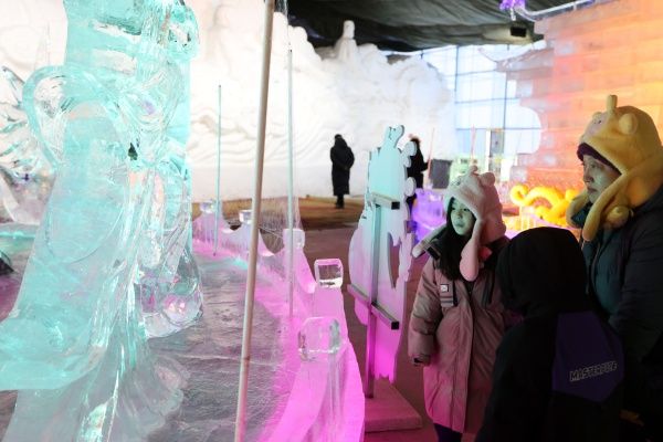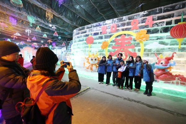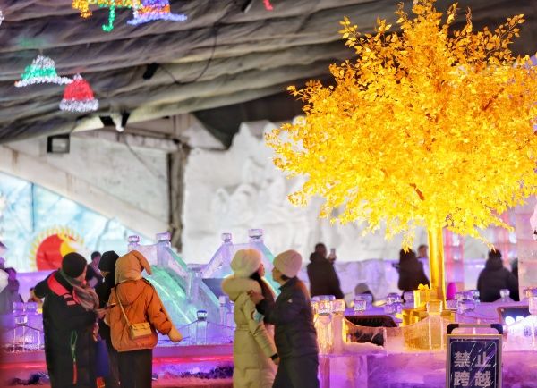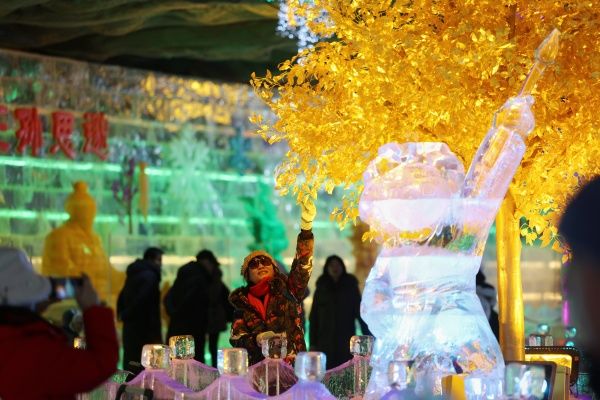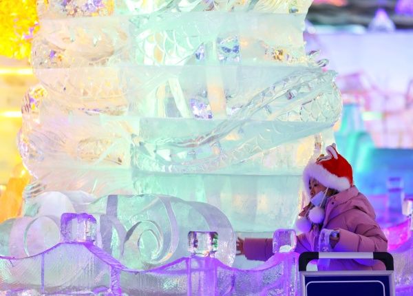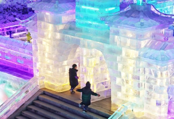 2024年1月15日,北京,延庆区龙庆峡第38届冰灯冰雪冰嘉年华,小朋友在冰灯展区玩耍。