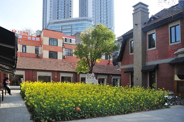 图为上海愚园路的愚巷休闲区,油菜花盛开,金灿灿的色彩与周边的老洋房“混搭”,给愚园路街头带来了独特的田园风光。