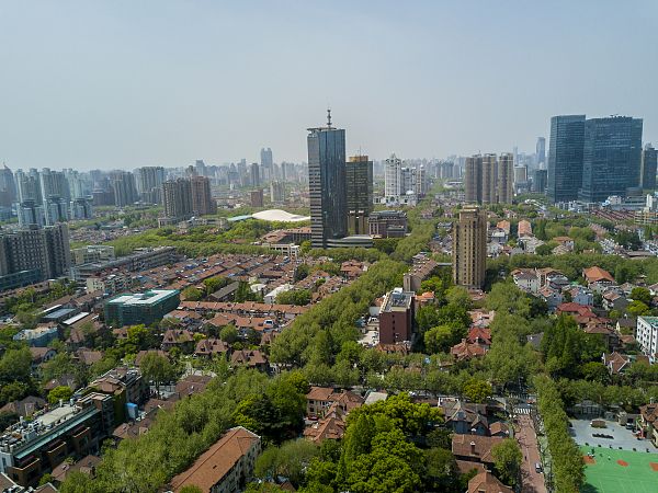 复兴中路,这里的建筑风格多为法式和英式,街道两旁的树木郁郁葱葱,让人感受到一种浪漫和历史的气息。图为航拍上海复兴中路。