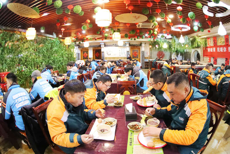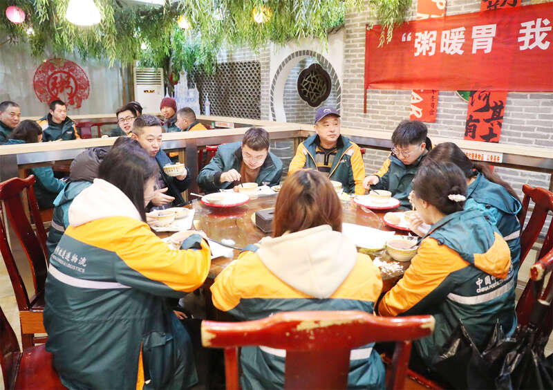 1月17日,快递小哥们在一起喝腊八粥。张进刚/摄