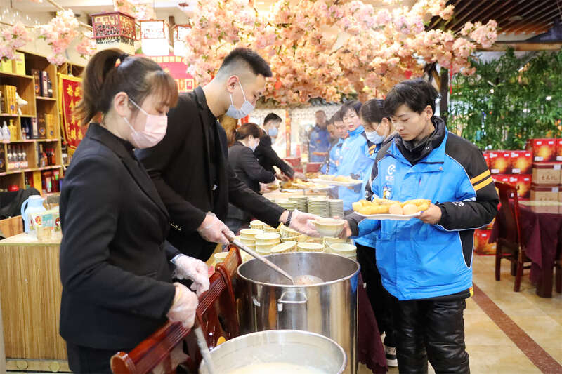 1月17日,店里的服务人员给外卖小哥盛上热腾腾的腊八粥。张进刚/摄