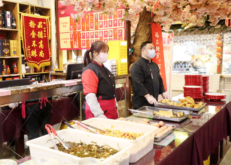 1月17日,店里还给外卖小哥、快递小哥准备了油条、鸡蛋、蒸饺等各种餐食。张进刚/摄