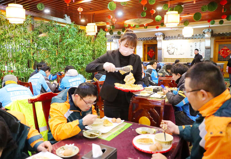 1月17日,店里的服务人员给快递小哥夹蒸饺。张进刚/摄