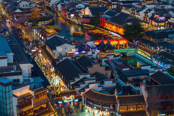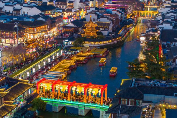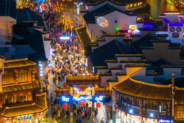 2024年3月3日,南京,夜幕降临,夫子庙亮起花灯,古色古香的建筑与流光溢彩的花灯交相辉映,令人流连忘返。近年来,南京倾力打造非遗文化品牌秦淮灯会,吸引了大量市民游客前往赏灯游玩。人们在观赏花灯的同时,品味当地特色美食,选购旅游纪念品,点亮古都“夜经济”,让城市有了更多烟火气。