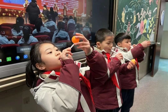 赵志远的开学第一课,主要是和孩子们玩一个互动游戏——用一根吸管吹气,让乒乓球悬浮在空中。赵志远在主会场演示,4个校区的5000多名孩子,一边观看视频直播,一边也吹起了乒乓球。