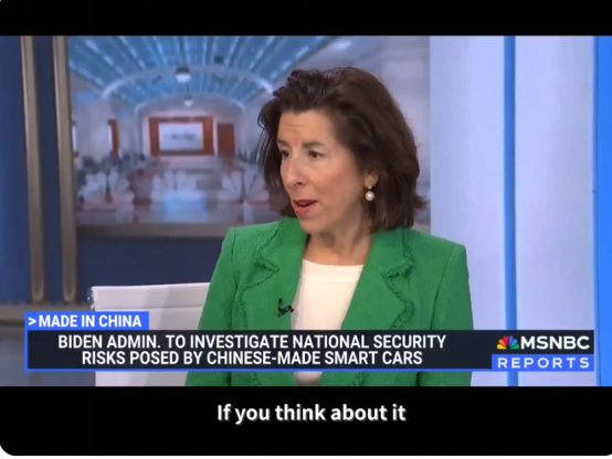 美国总统拜登当地时间2月29日宣布将对中国制造的汽车展开调查。在这一背景下,美国微软-全国广播公司(MSNBC)3月1日发布雷蒙多接受该媒体采访视频。受访期间雷蒙多极力渲染“中国威胁”,对中国汽车发表惊人言论。她声称如今的汽车如同“装了轮子的iPhone”手机,可以记录大量信息,“想象一下,假如世界上有100万辆汽车,比如有数百万辆中国汽车在美国的道路上行驶,每天每分钟都在收集数百万美国人的数据,然后把这些数据传回北京……”雷蒙多还宣称,“试想一下,假如有300万辆中国汽车行驶在美国道路上,而北京可以让它们同时熄火。”