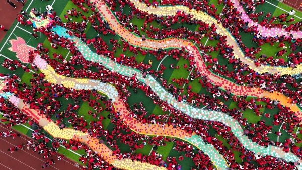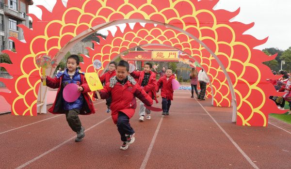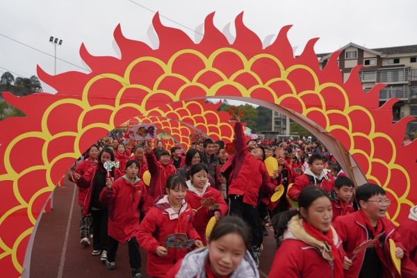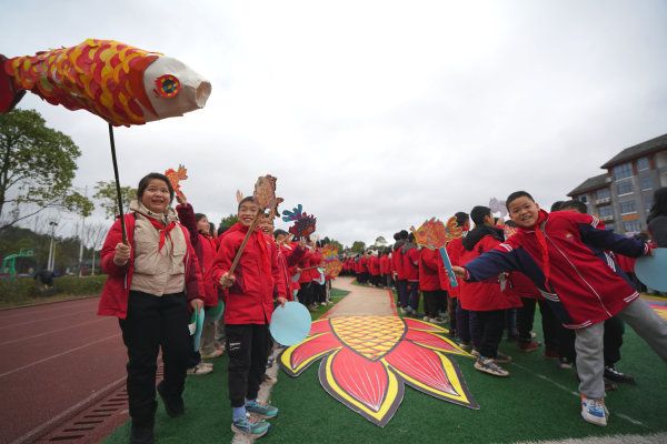 2024年3月4日,湖南怀化,通道侗族自治县礼雅小学,学校师生在开学典礼上举行唱国歌、贴“龙鳞”、穿越“龙门”等活动,欣欣向“龙”迎接新学期的到来。