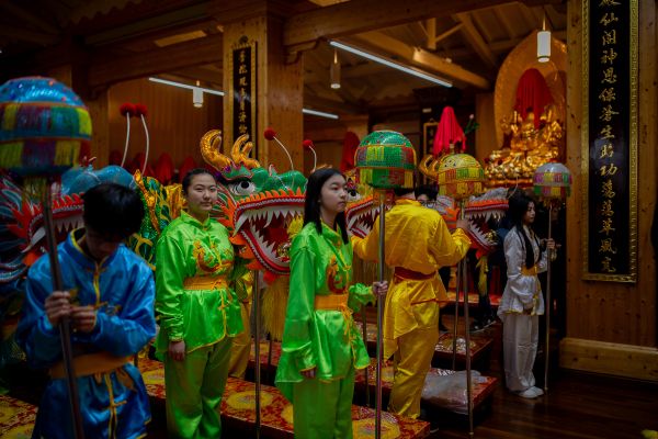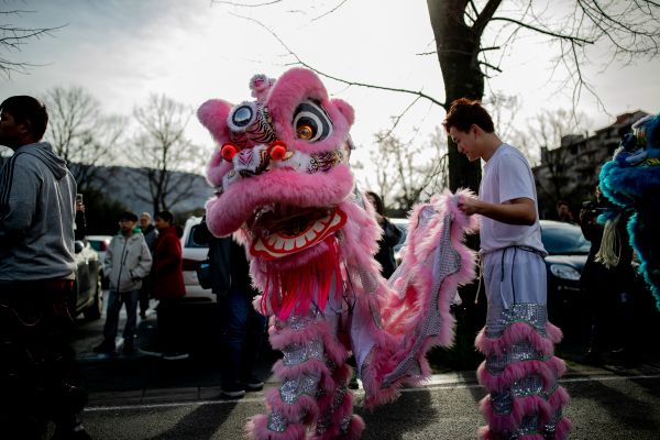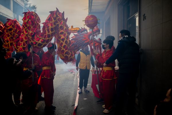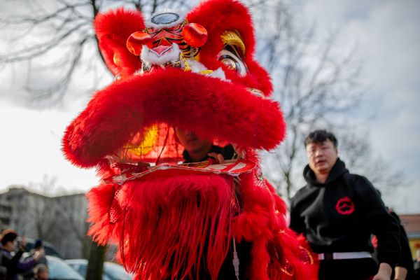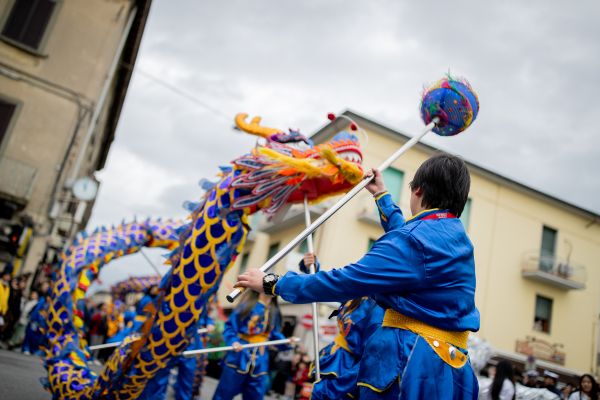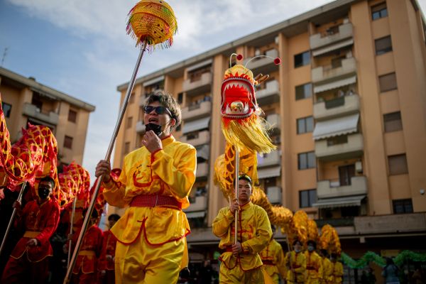 当地时间2024年3月3日,意大利普拉托,在活动期间,参与者沿着城市的街道行进。中国社区举办活动,庆祝龙年。